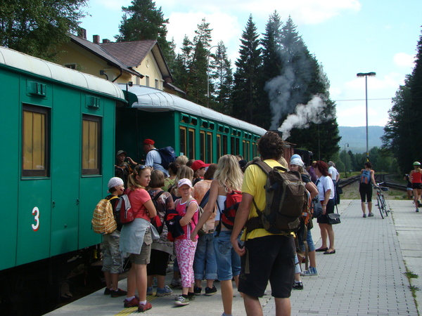 當火車超過預定時間十多分才抵達我們的第一個轉車站Tábor時,我們已經非常憂心這下要搭的火車早開走了,加上查時刻表時明明是在第三月台轉車,但是這個車站根本沒有第三月台,只看到數條鐵軌上三三兩兩的停靠著二節的、三節的火車,我著急的爬上第一月台找應該是站務人員的先生遞上下一站的站名,他一語不發帶我們到看得到火車的地方指著只掛一節車廂的火車,衝到那節火車又遞一次站名給查票員看才敢上車,起先幾站不斷有人上車但是逐漸只下不上,查票員常常進來大喊幾聲看有否人反應,文盲的我們不知所云,但是我可以猜想他是問下一站有否人要下車或是有沒有人要打票之類的,因為火車早把我們帶到捷克的鄉下,大家都是上車才打票。窗外的景色是廣大的森林和一望無際的田野交織成的,小城小鎮的房屋都非常集中所以原野間沒有任何建築,也可以看出捷克還有豐富的森林資源。